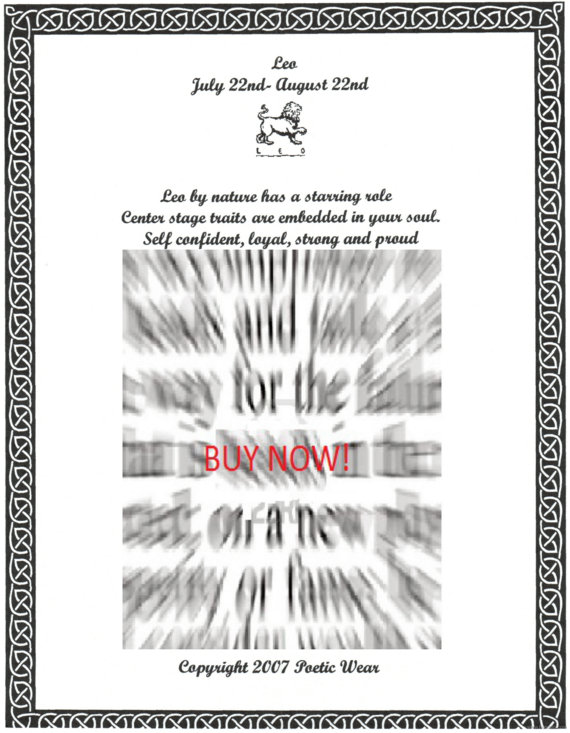 Are you the bossy LEO? Bullheaded TAURUS? Poetiscopes are unique astrology descriptions that describe you to a T poetically. Know your true self or just find out a little more about someone better than they know themselves. These unique frame-ready zodiacs descriptions reveal secrets about you! Get all 12 astrology signs now! If youre a LEO or know someone who is, INSTANTLY download your poetic birth sign in its entirety along with the 11 other zodiac descriptions and find out WHO YOU REALLY ARE! DOWNLOAD THE ZODIAC SIGNS NOW! Youll be glad you did!
